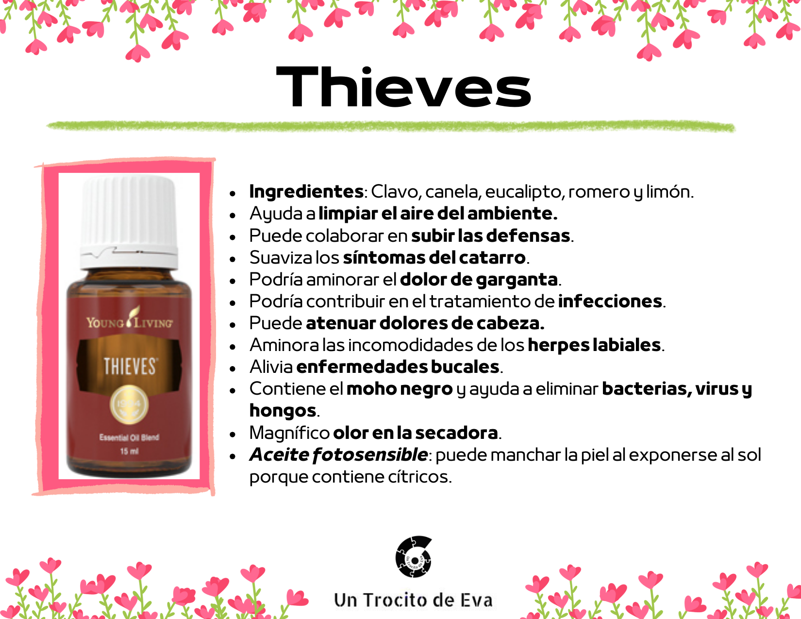 Te deseo que encuentres lo que buscas al leer estas propiedades que nos traen el clavo, la canela, eucalipto, romero y limón. Estos aceites tienen una historia muy interesante, ya que eran los aceites que utilizaban los ladrones para robar en épocas de la peste negra 😊